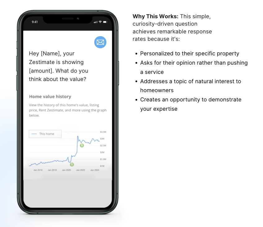 Text 5–10 contacts/day a screenshot of their Zestimate asking: “What do you think about this value?”